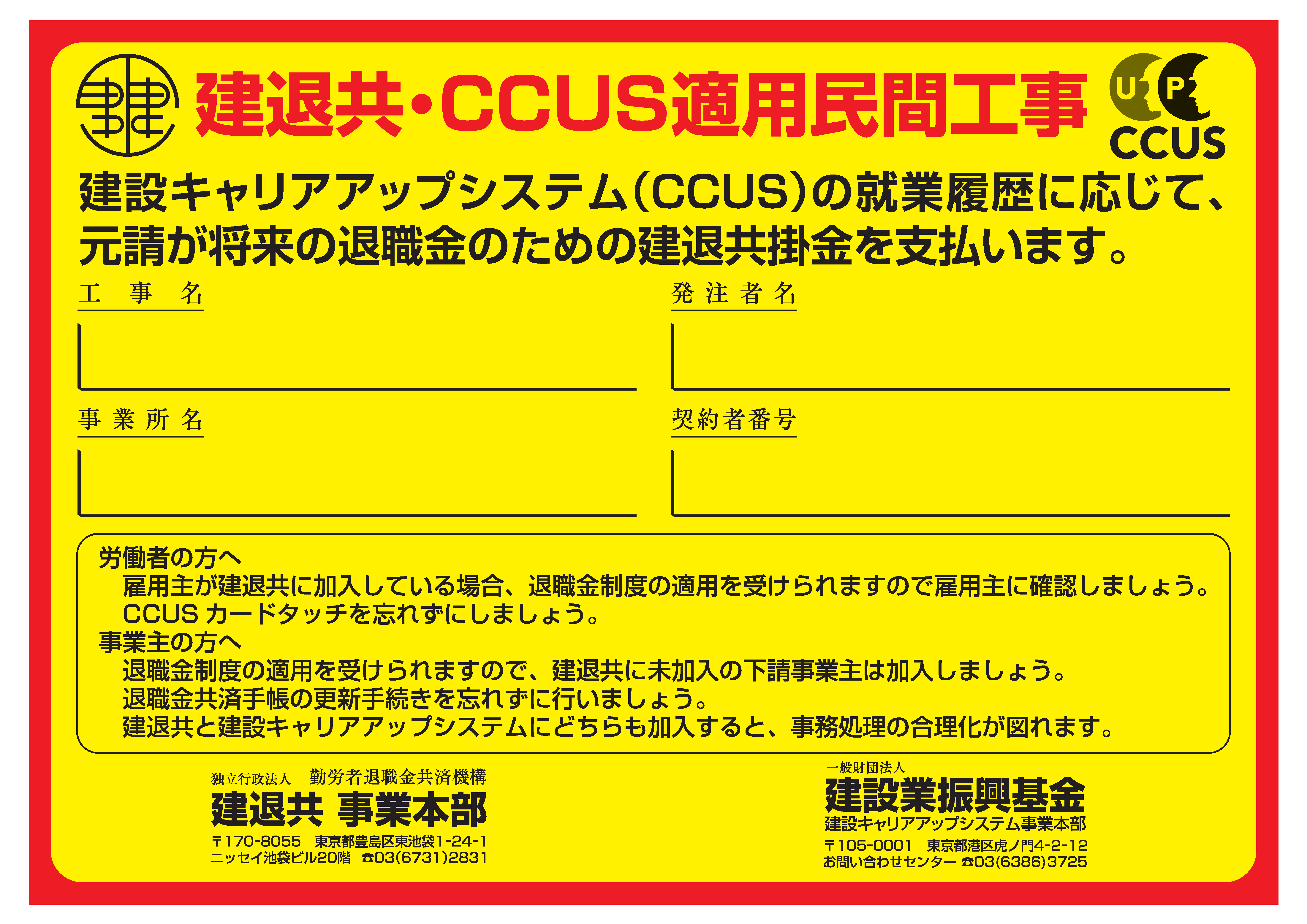 工事名、発注者名、元請事業主名、共済契約者番号を記入していただく現場標識です。