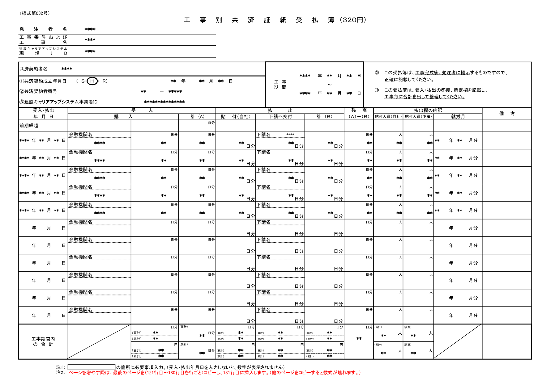 (建設業退職金共済証紙受領書を含む) - 工事別共済証紙受払簿(様式第032号)